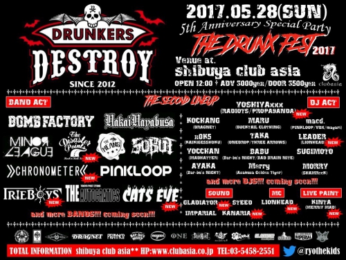 - 2017/05/28(SUN)Shibuya Club Asiaにて開催される。DRUNKERS DESTROY!!5周年企画"THE DRUNX FEST 2017"に出演決定致しました!